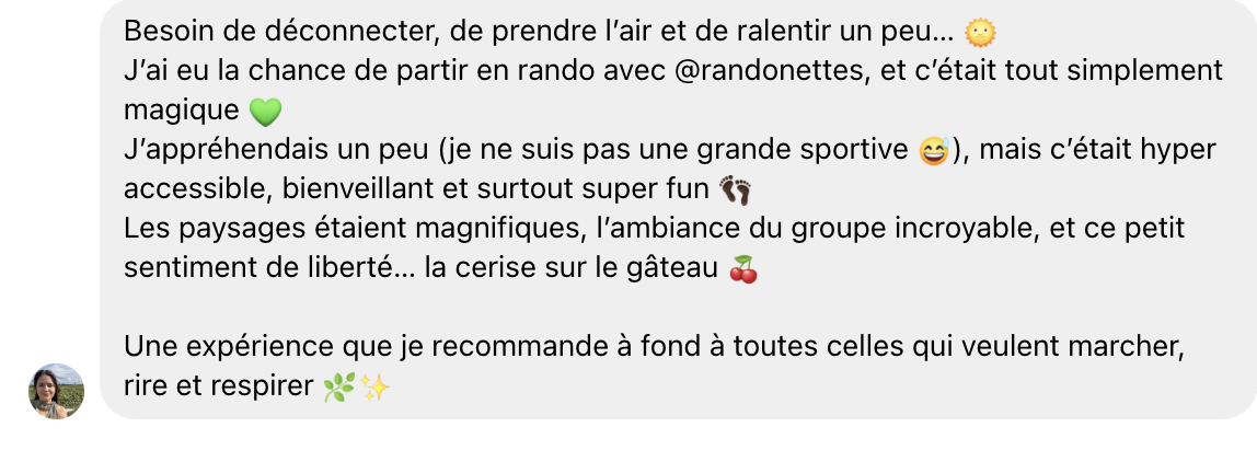 C’est de là qu’est née Randonnettes, mon groupe (associatif) de randonnée. Un projet qui est parti d’une plaisanterie et qui est devenu une vraie aventure collective. Je vous invite à me rejoindre, seul, en famille, en groupe, ou avec mon chien Paolo, qui m’accompagne partout et transforme chaque sortie en moment inoubliable. Ensemble, nous découvrons les plus beaux paysages de Marseille et des environs, faisons connaissance avec des personnes qui partagent l’envie de connexion et de nature, et transformons chaque pas en souvenir.
